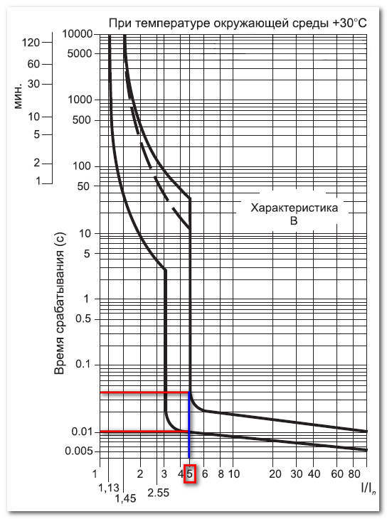 2. Если через автоматический выключатель будет проходить ток, равный 10·In, то он должен отключиться за 0,01 секунду в горячем состоянии или за 0,03 секунды в холодном.